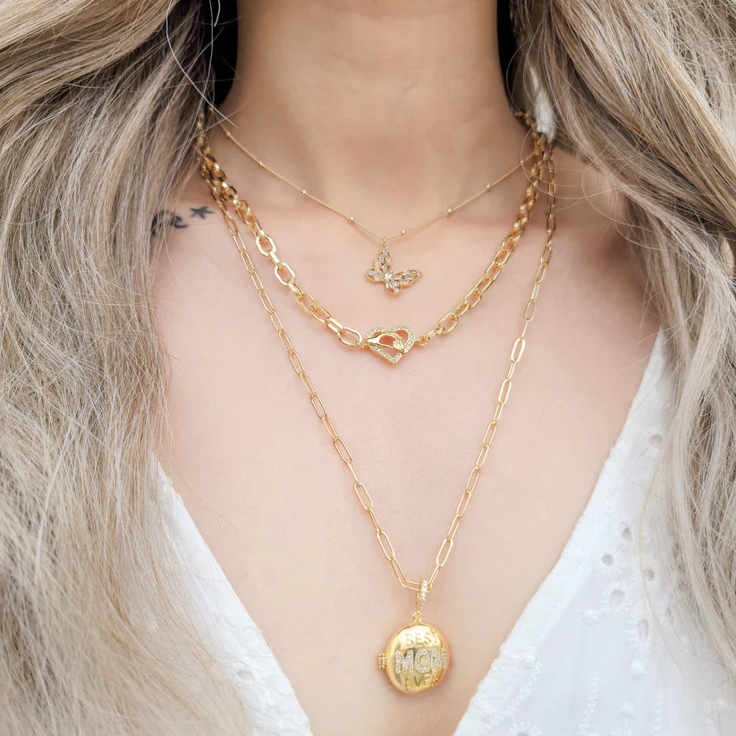 Gold plated box chain necklace with cubic zirconia heart with a mom's hand holding a child's hand.