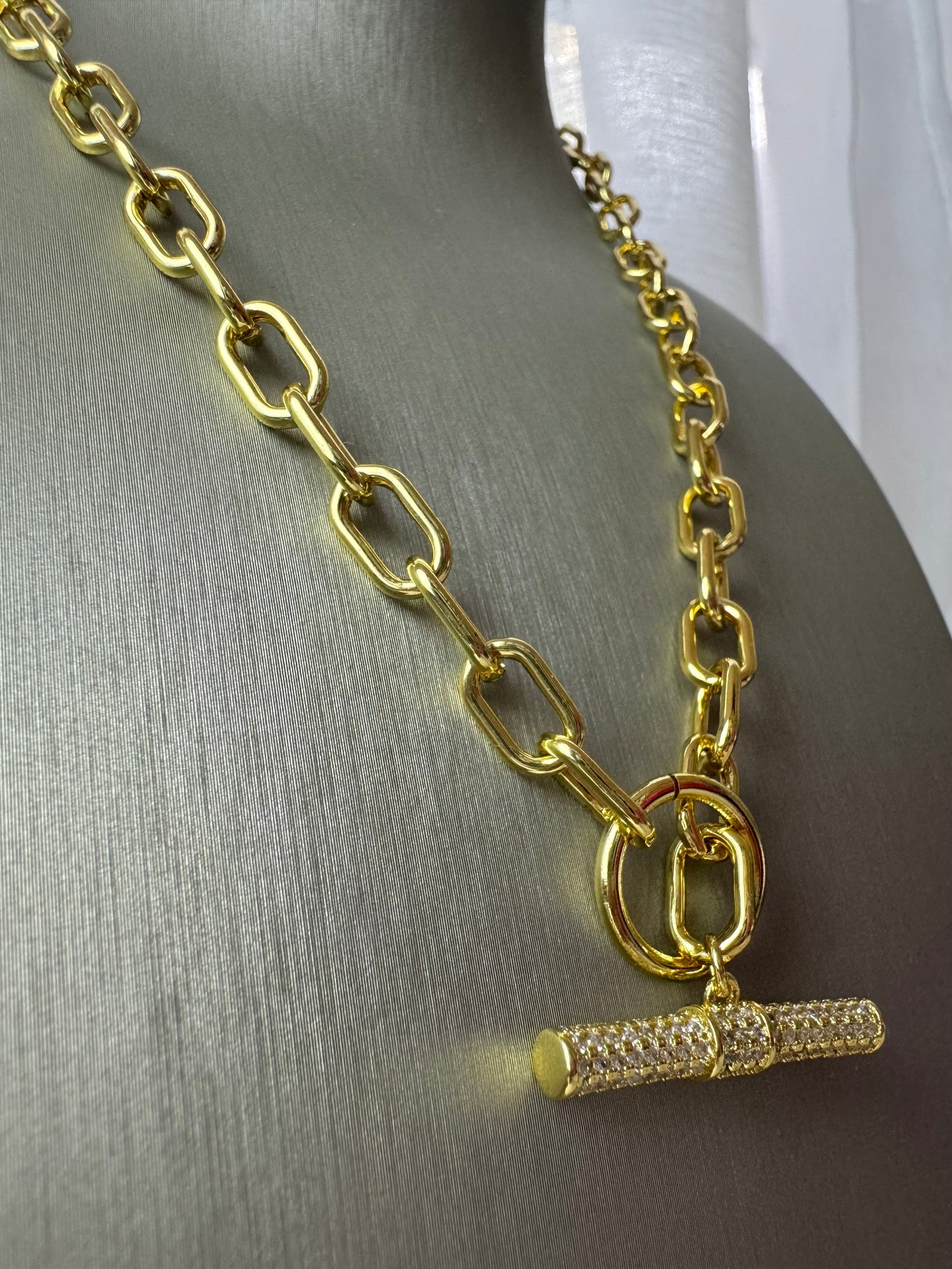 Precio unitario porBeautiful Golden Chain, 18k Triple Gold Plated and Zirconia, Toggle Closure, 16"inch long.