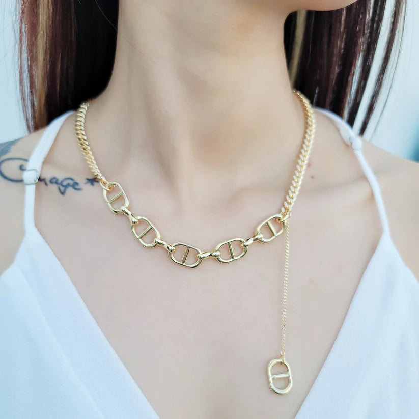 18" curb chain necklace with flat mariner link section, accented with a flat mariner drop.