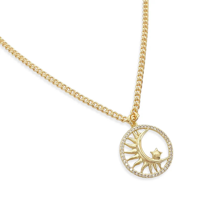 Gold plated tiny curb chain necklace with moon and star in a cubic zirconia circle cutout.