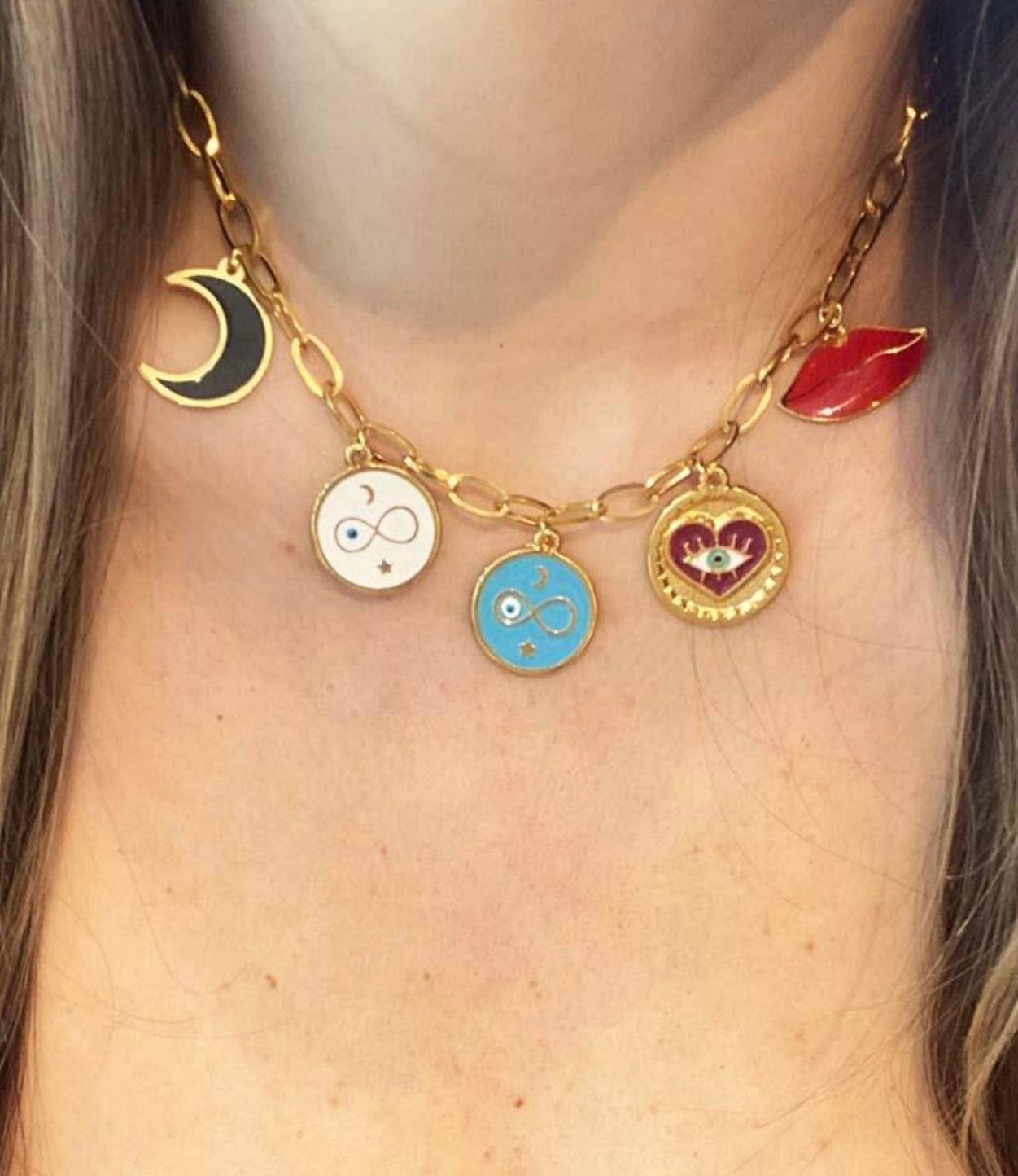 Añade un toque de brillo y color a tus atuendos con este collar Gold Plated con dijes de resina. Cada dije está cuidadosamente elaborado y bañado en oro, brindando elegancia y un estilo único a tu look. ¡Haz una declaración de moda con este hermoso collar!