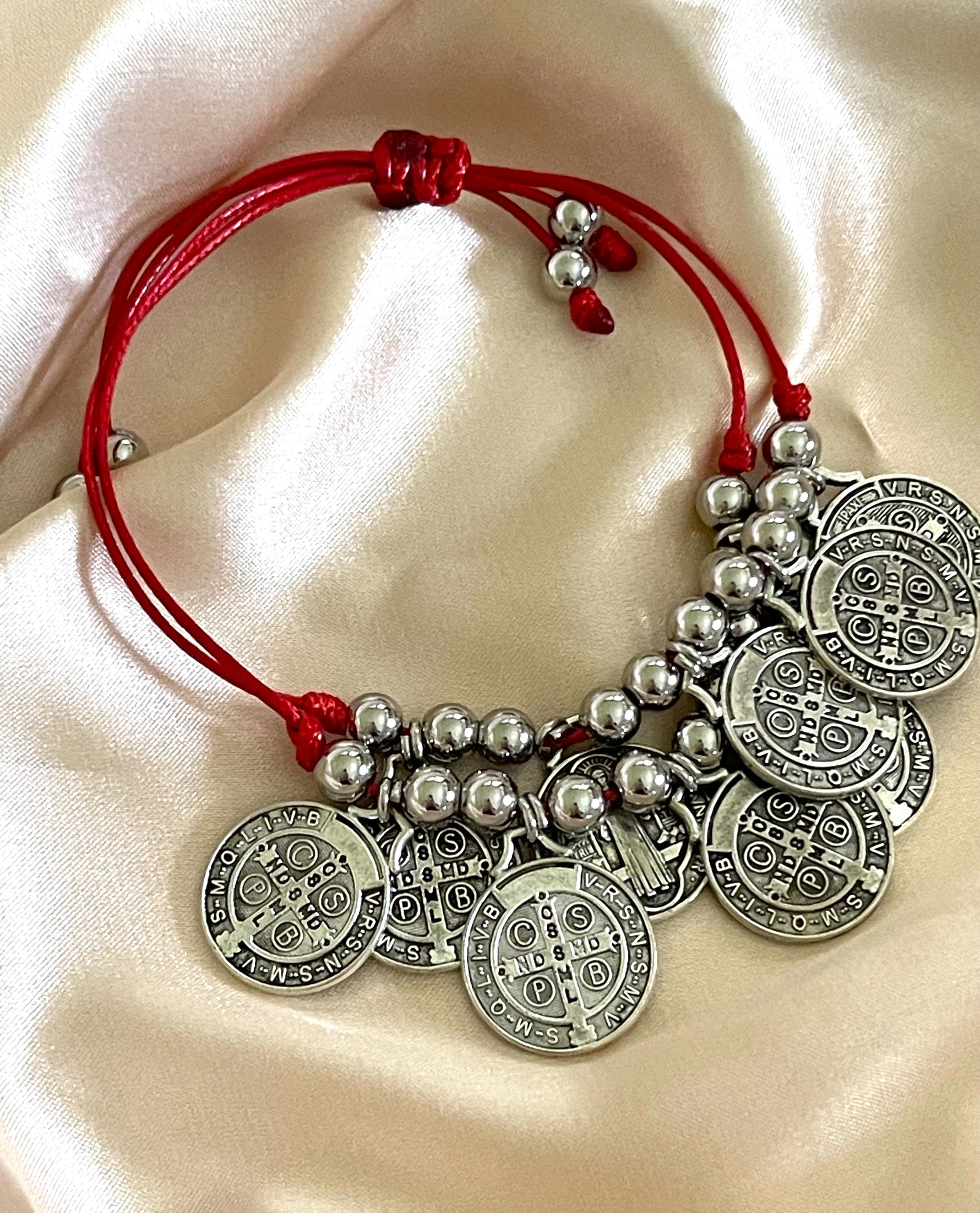 Precio unitario porCordon doble en cuero, con medallas de San Benito en Zamak, baño de Oro de 24k y balines en acero dorado. Pulsera ajustable hasta 9.